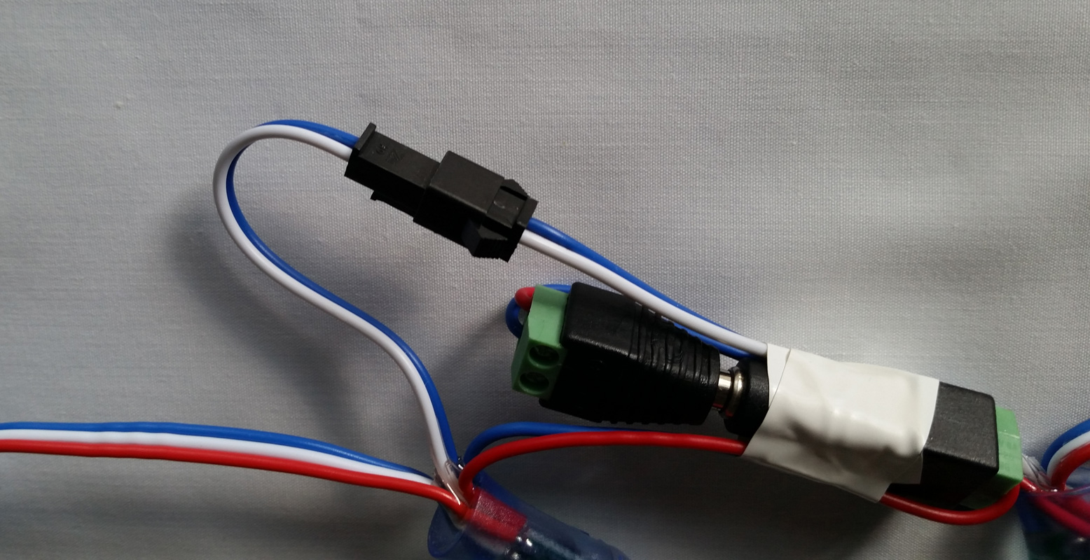 Out of the box, the lights won’t be very useful for what we have in mind so we’ll have to wire up new power connectors with our DC power jack adapters.