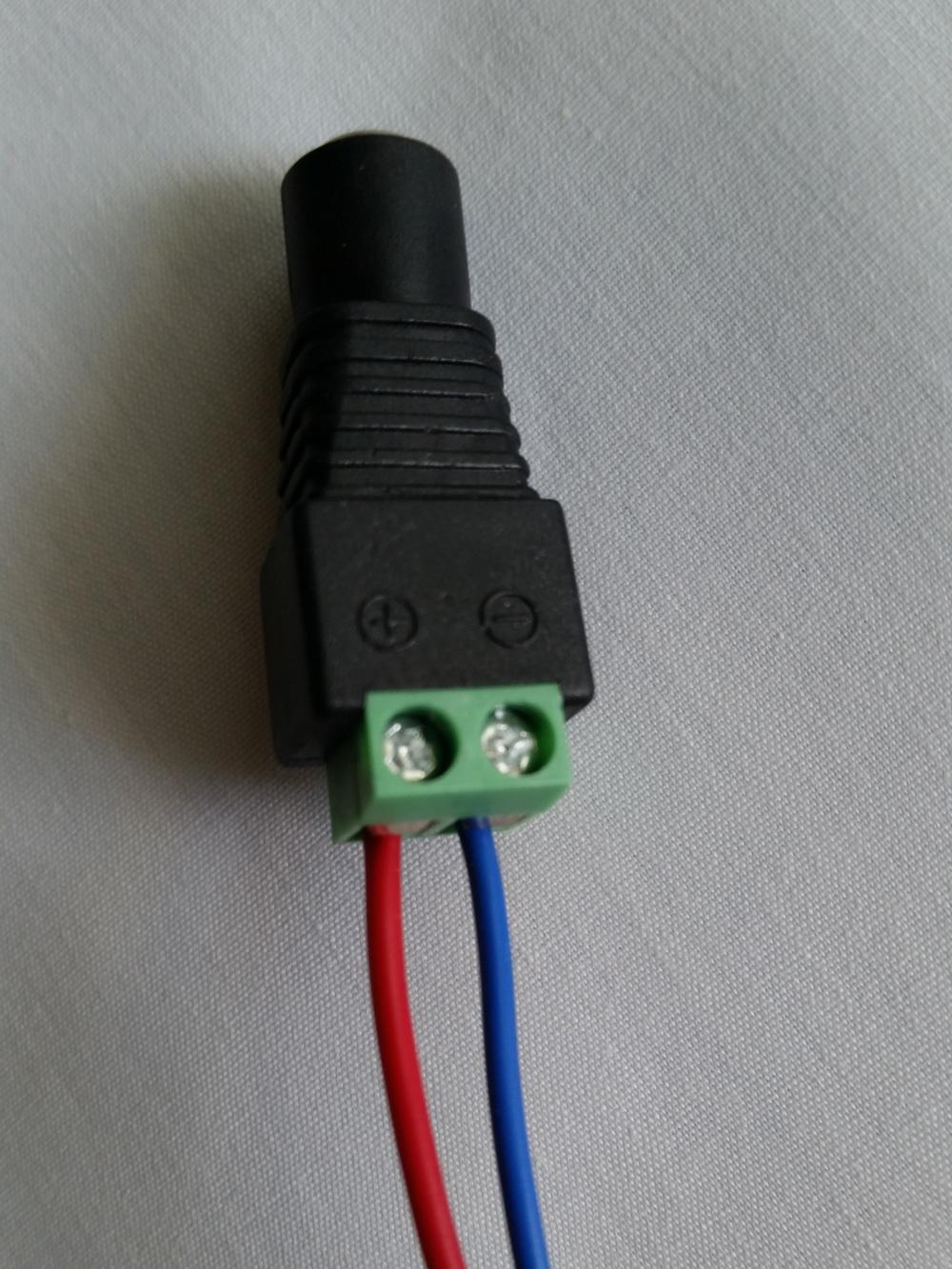 Once we have the wires cut and stripped, we can run the +5 to the + terminal of our female DC jack, and the ground wire to the – terminal and tighten them down. This is where our power supply will plug in.