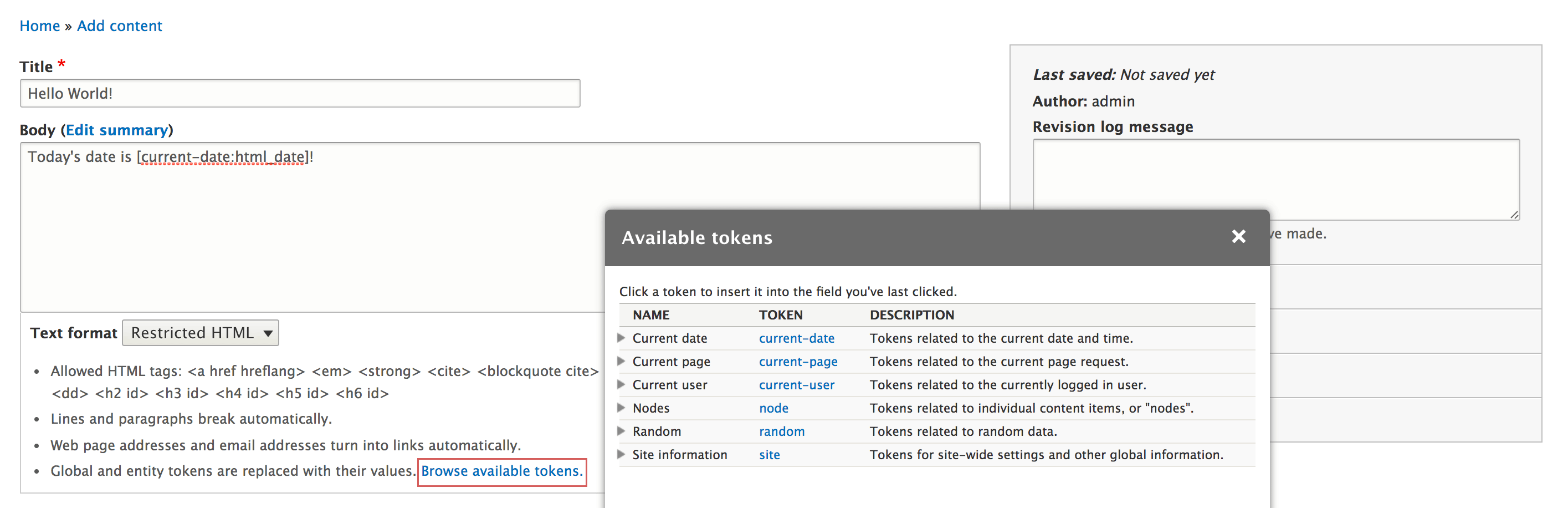 Once that’s checked and saved, any content type that uses that text editor will now have the option to use token, and they will also have a “Browse Tokens” link which will open up a modal with available tokens: